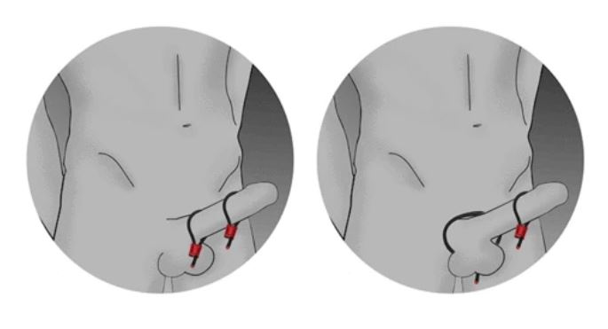 - Um loop na haste e outro ao redor do escroto.